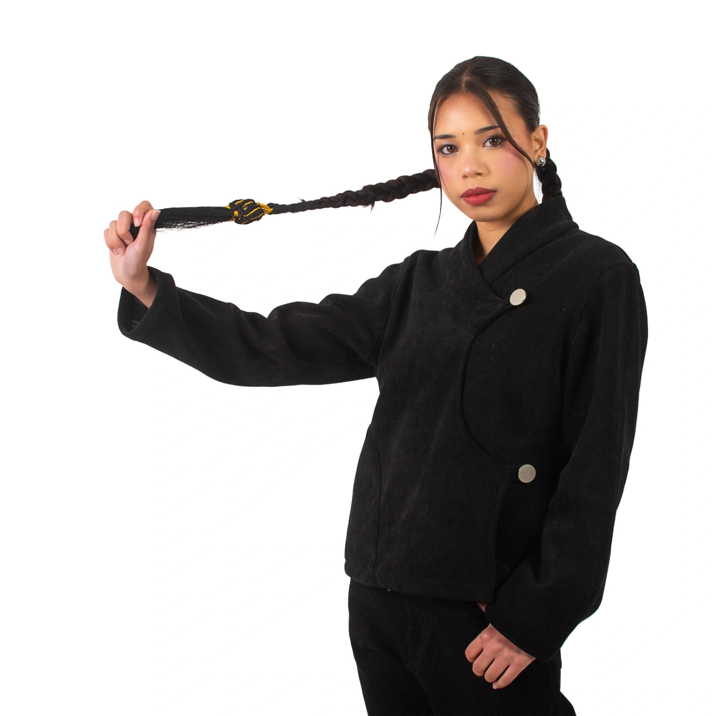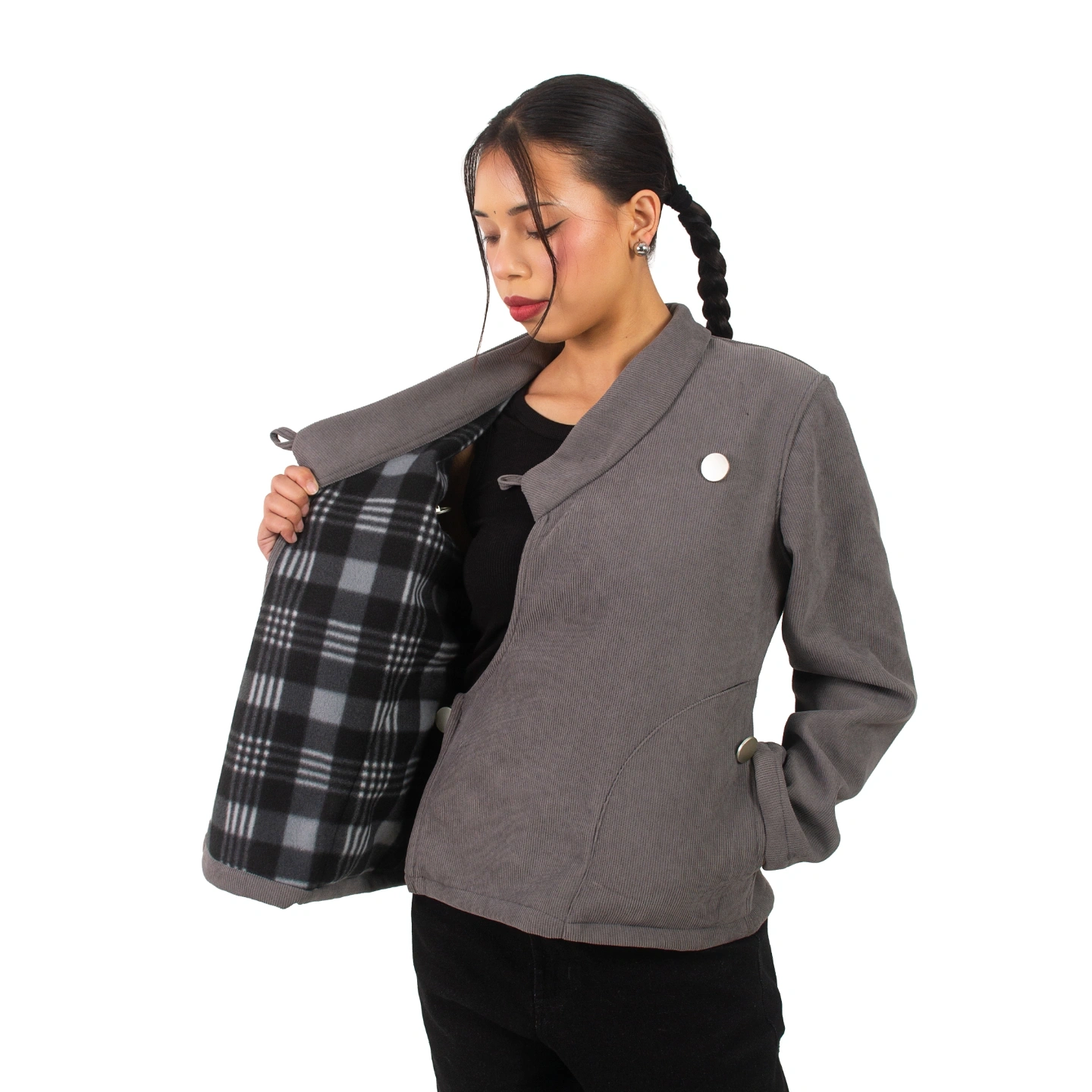 Corduroy fabric with fleece inside which can be reversed as a diffrent jacket.